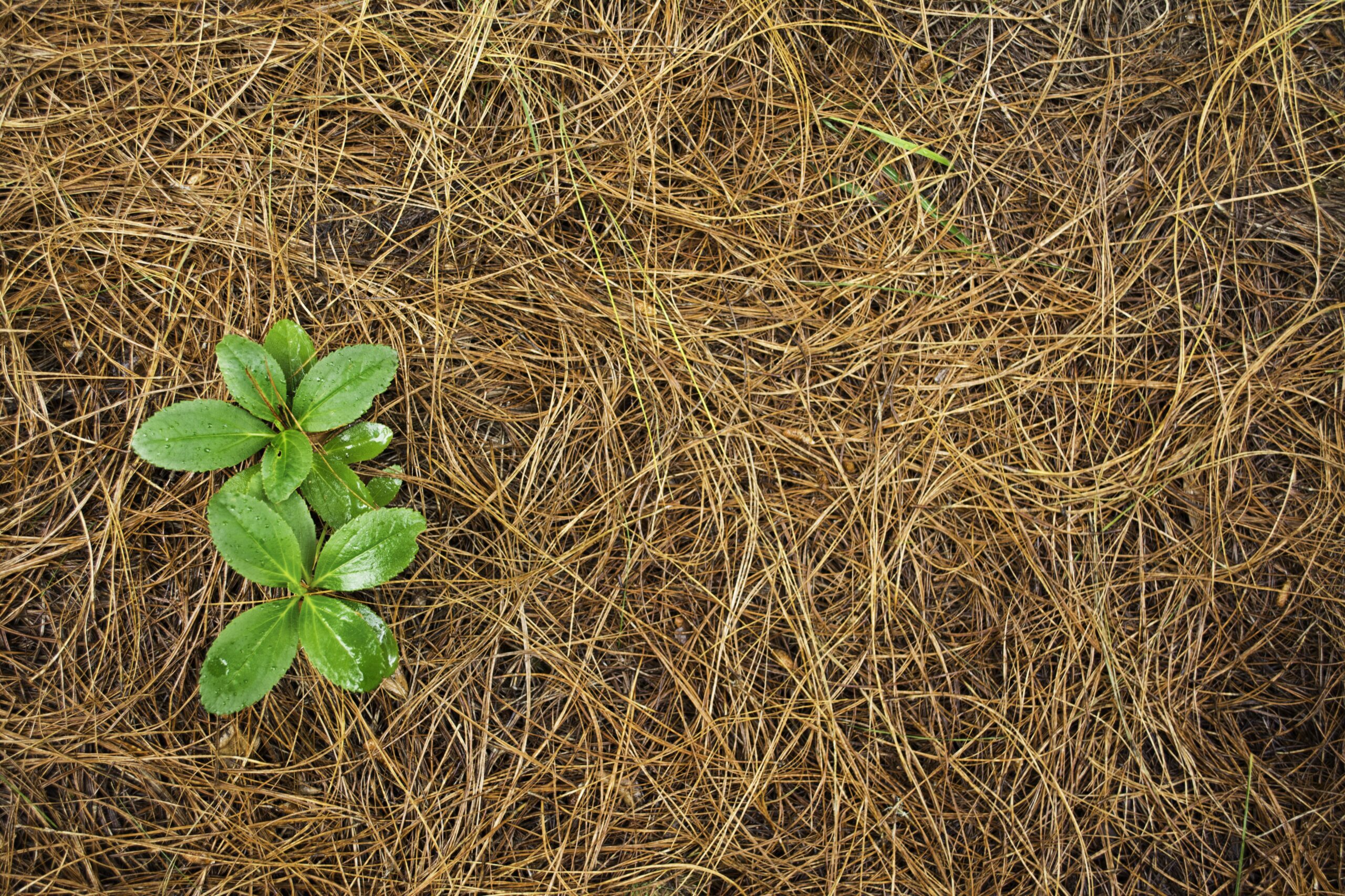 Weeds in a Grand Ledge mulch bed growing among shrubs and flowers